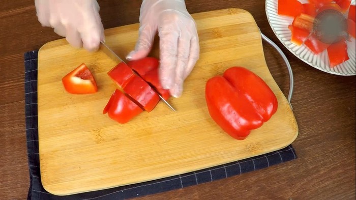 Болгарский перец разрезать пополам, очистить от семян. Нарезать на кусочки, похожие на квадратики.