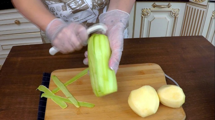 Кабачок и картошку почистить и нарезать кружочками толщиной 1 см.
