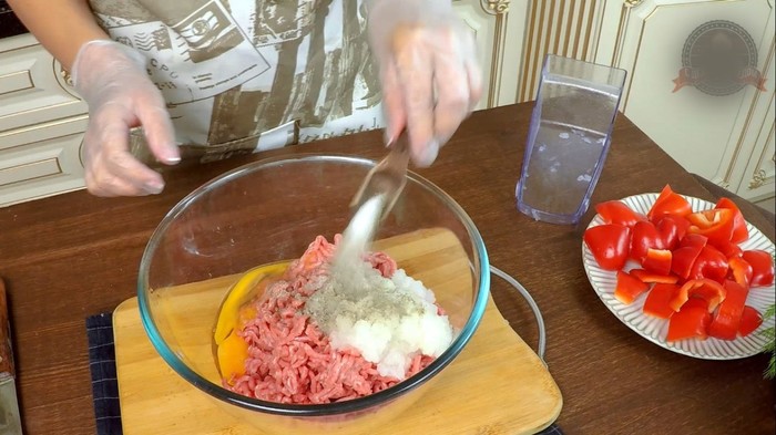 В глубокую чашу выложить фарш (у меня говяжий, но можно использовать любой). Добавить лук, яйцо, щепотку соли и черный перец. Хорошо перемешать удобным для вас способом. Затем отбить несколько раз об чашу. Так котлеты из фарша будут более нежными. Сформировать на не большие круглые котлеты (из этого количества фарша получается примерно 12 котлет)