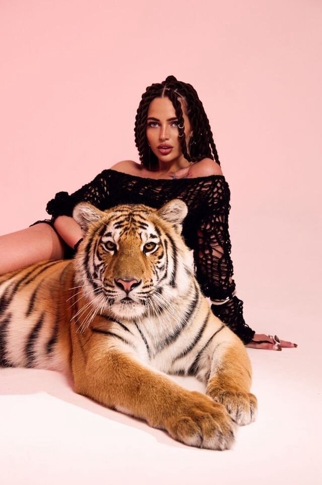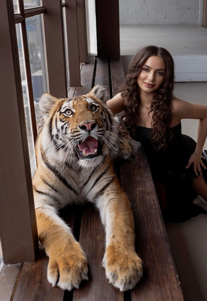 Тигрица выросла с маленького возраста с человеком, привыкла позировать на камеру.