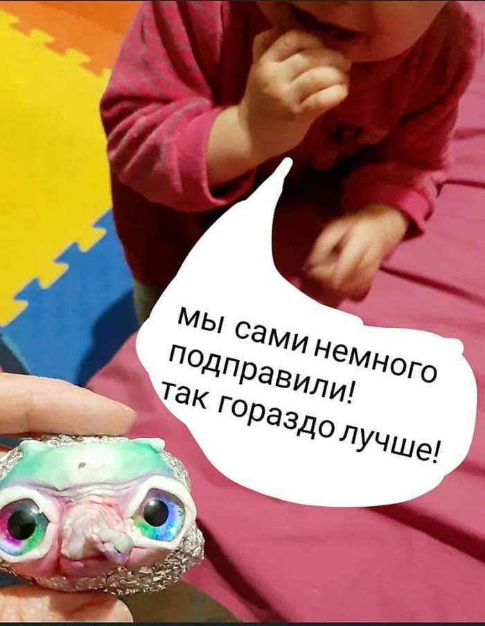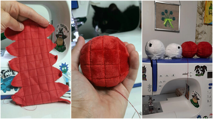 Глазки. Красные цельными шарами, а белые с отвертсием внизу. Сетку прошила строчкой на машинке. Чёрные зрачки-звёздочки, как в Рик и Морти - машинной вышивкой.
