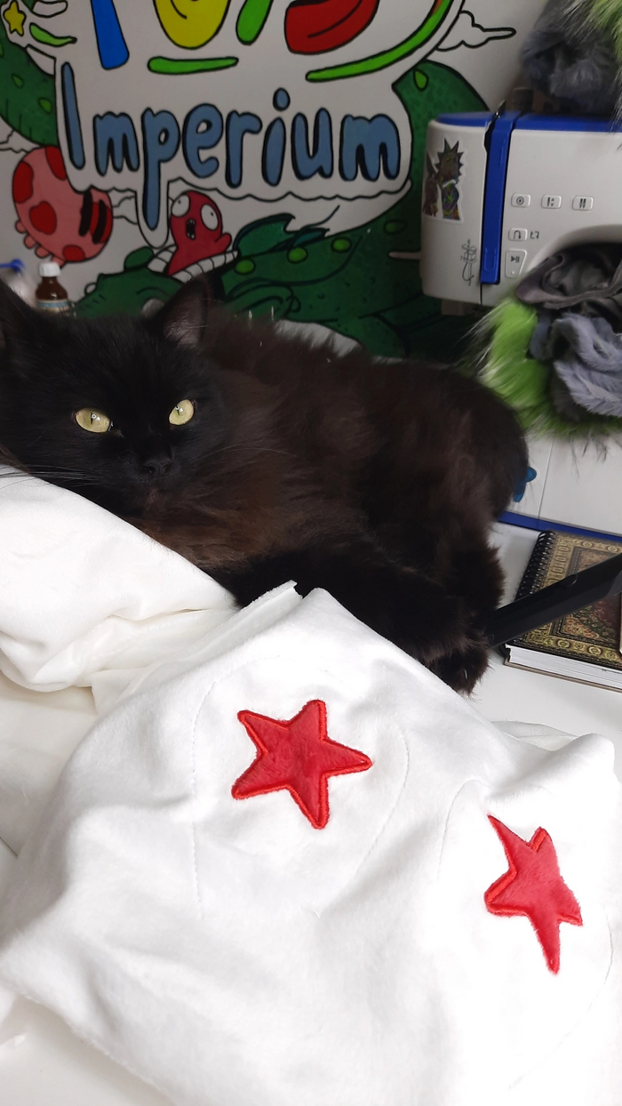 Снаружи чёрная ткань, внутри звёзды. Их печатаю сублимацией на белом плюше.