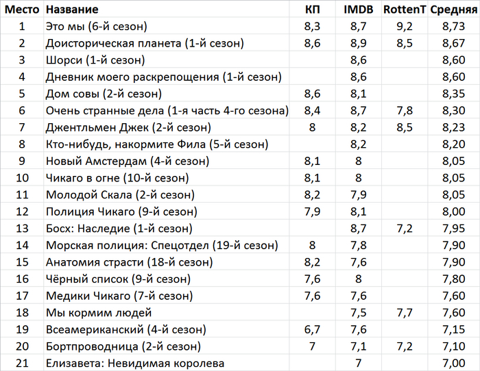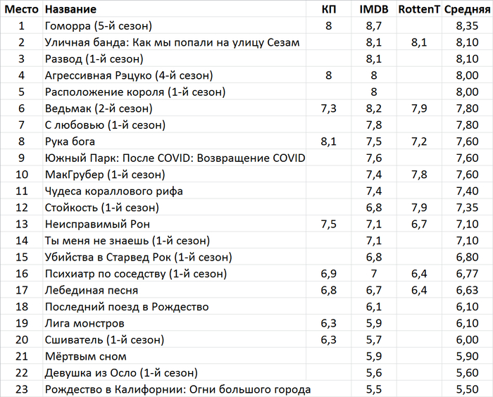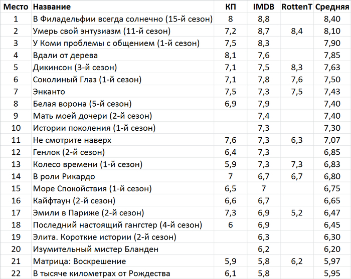 Таблица с рейтингами Кинопоиска, IMDB и Rottentomatoes.
