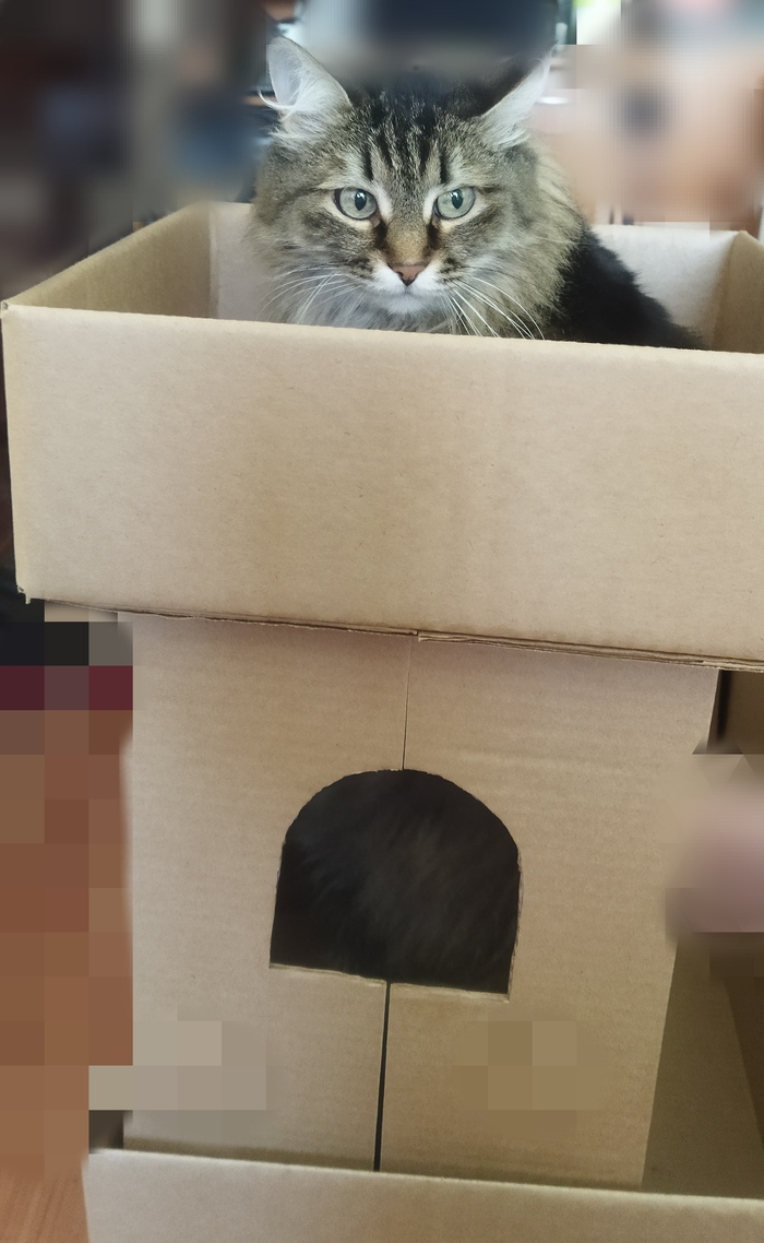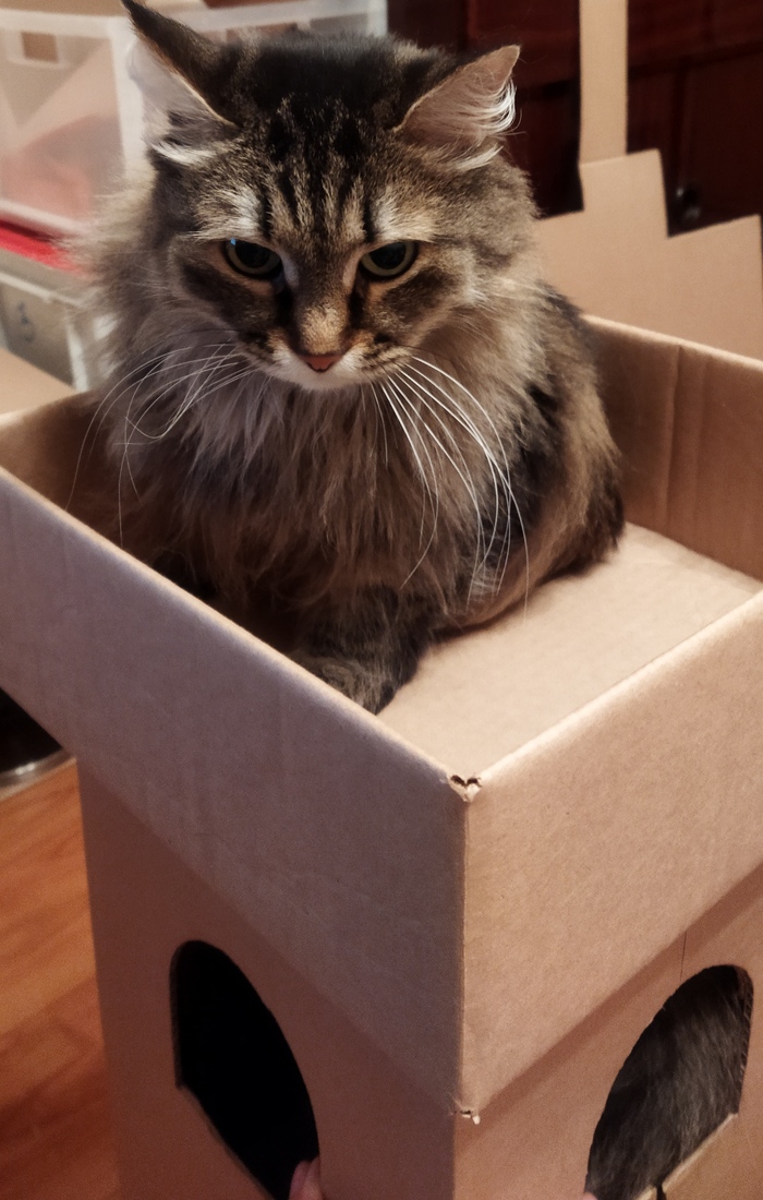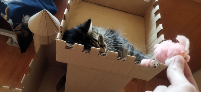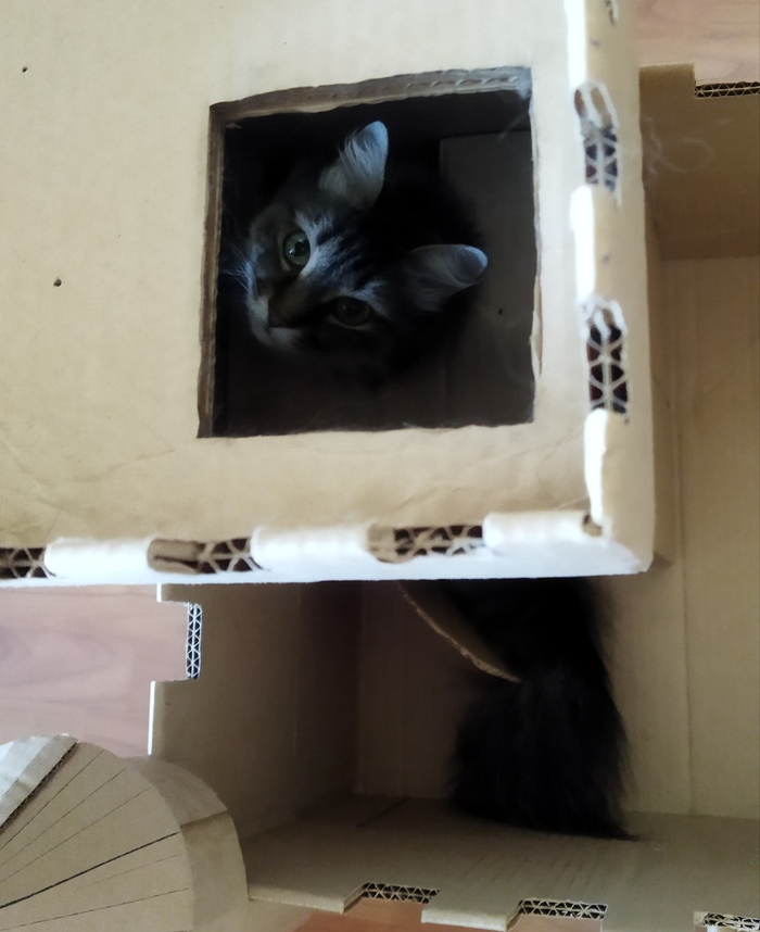 Строительство основной башни с двумя этажами и балконом. Размер коробки 610*220*230. Внутри "полочка" с отверстием на второй этаж. Ну и вырезано ещё отверстие на сам балкон. Пол у балкона в четыре слоя картона. Так что толстая кошачья попа держится отлично, ничего не проминается. :)