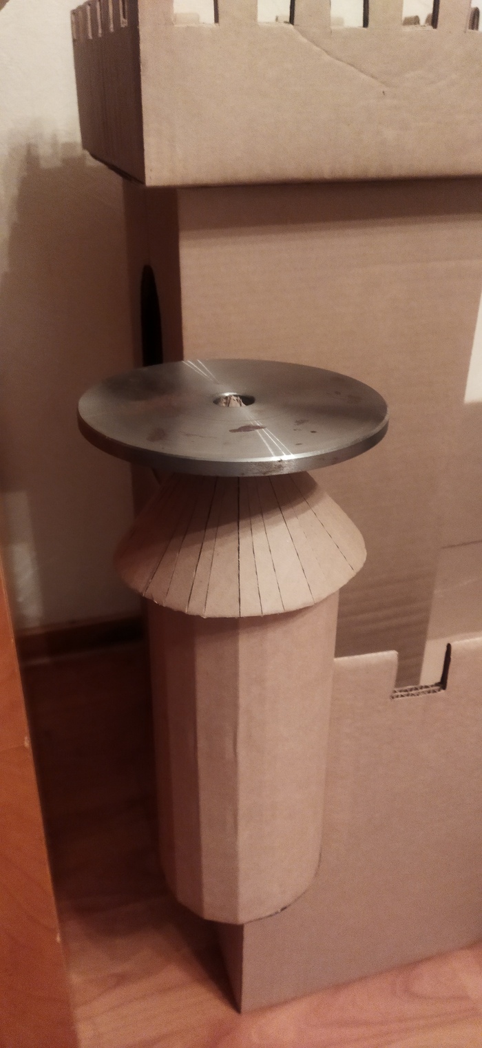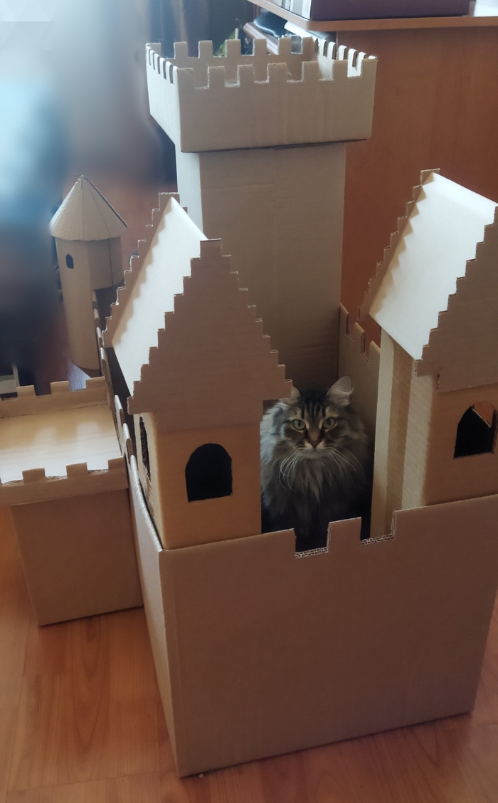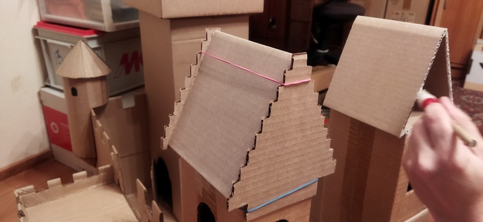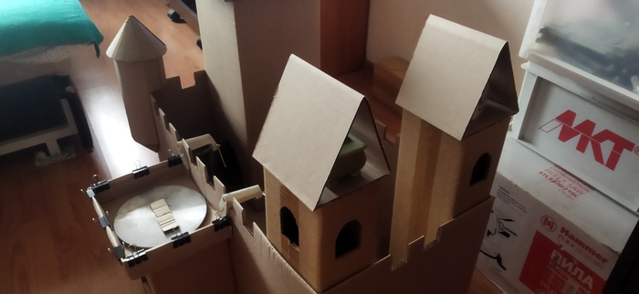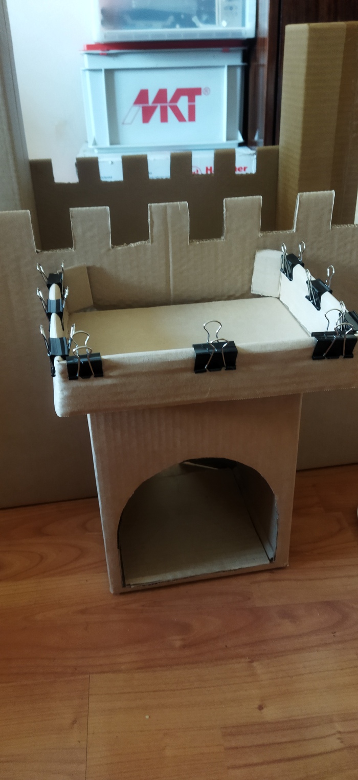 Сделали что-то вроде смотровой башни с угла замка. Крыша приклеена на торцы. Снизу пришлось повозиться, чтобы получилось стык-в-стык. Вырезала зубцы на балконе. Добавила пару окон для красавицы 😺. Почти настоящая крепость!