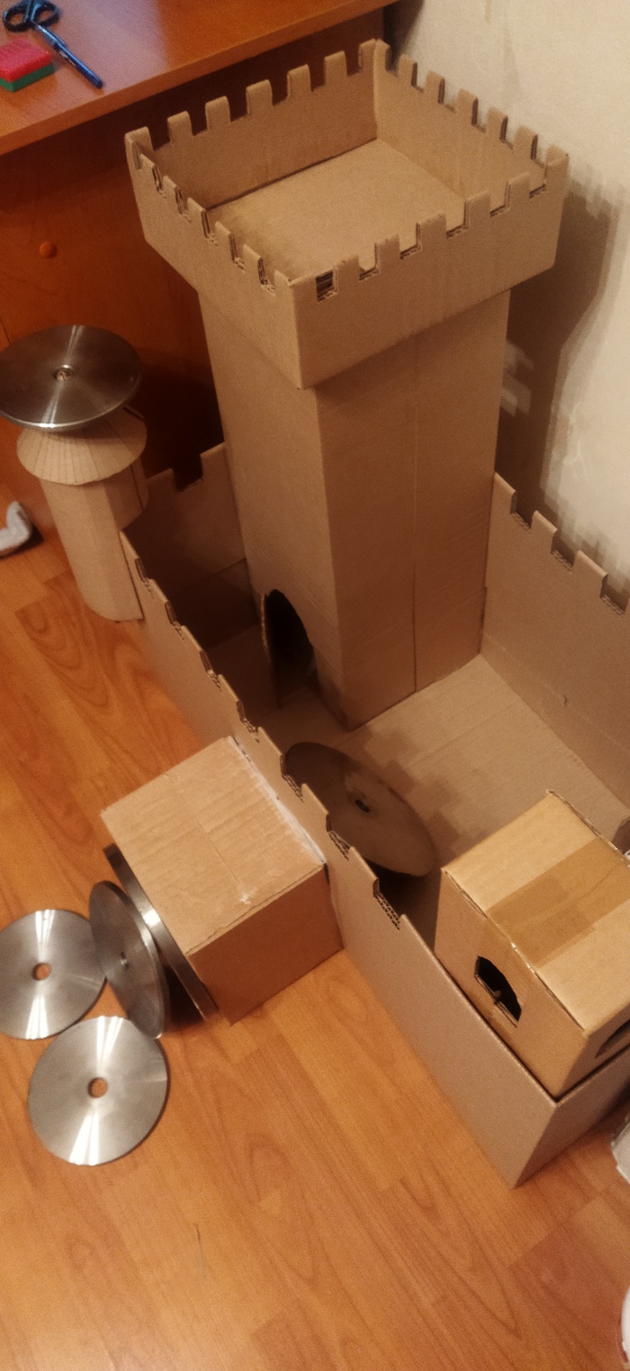 Купили новые коробки со склада. Не хотелось делать такое сооружение из чего попало. Самый большой гофроящик который является и основанием всего замка размером 800*400*360.
