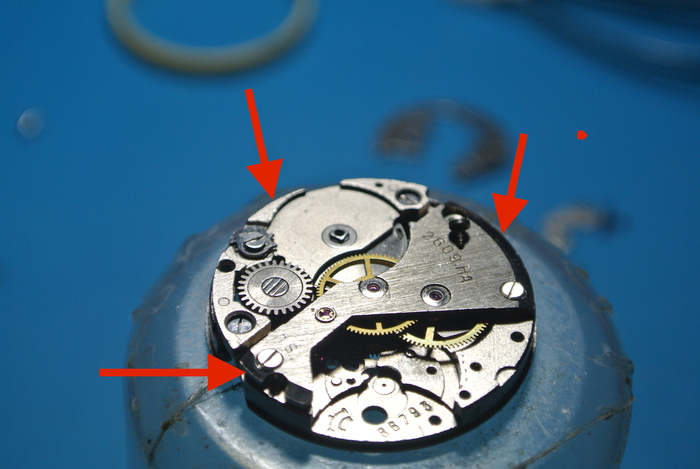 Вынимаем механизм, снимаем стрелки и циферблат. А тут отложения солей. Так же и внутри корпуса, со стороны заводной головки. Пропотели напрочь. Кстати третий винт вон где спрятался.