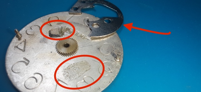 Теперь я понял почему пластина была приклеена к механизму и циферблату. На одной стороне где крепится ножка циферблата отсутствовал винтик , а с другой где видим обозначение кружочком ржавчина и застрявший там винтик без шляпки. Но я ценю свою время и чтобы не высверливать этот винтик выкручу все что есть на этом механизме а потом перекину на другой механизм.