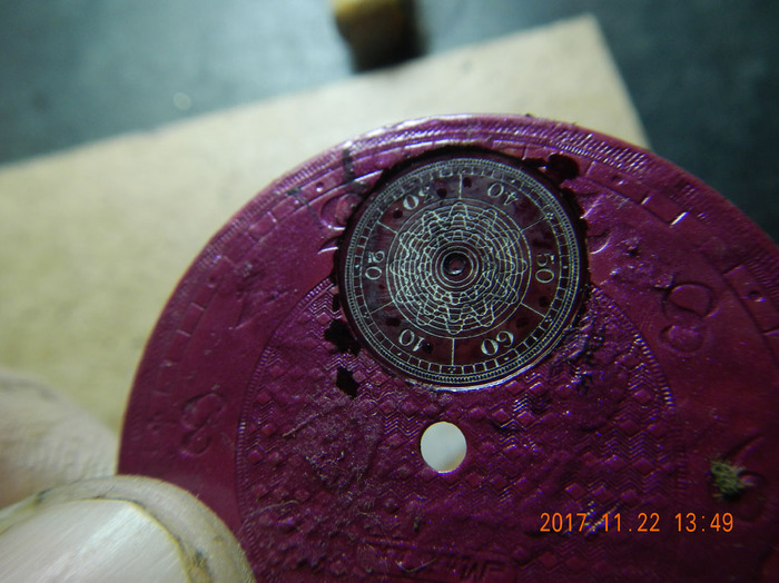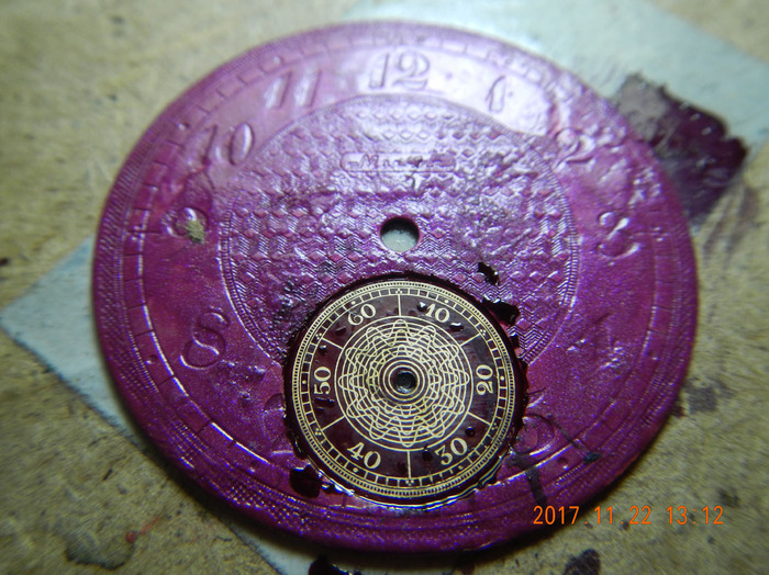 каким-то непостижимым образом ХЖ продиффундировало через лак и протравило рисунок на секунднике. Чудеса. Зашабрил секундник