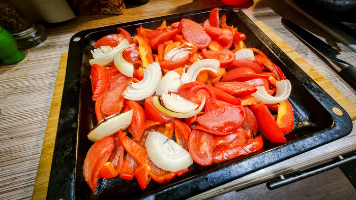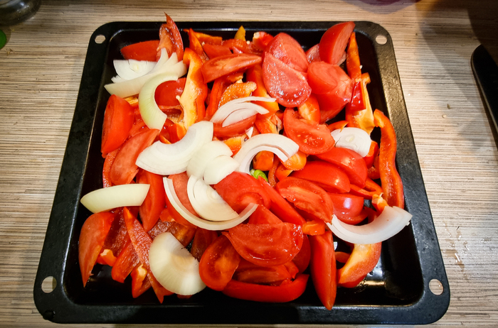 Нарезаем все наши овощи в свободной форме. Оставшимся маслом с обжарки ребрышек смазываем противень, выкладываем на него порезанные овощи и отправляем в разогретую до 200 градусов духовку на 30 минут, они должны как следует запечься.