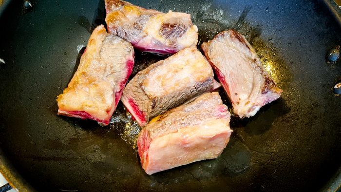 Для начала обжариваем ребрышки на сильном огне с небольшим добавлением растительного масла. Обжариваем по 4 минуты с каждой стороны. Оставшееся на сковороде масло и жир не выливайте, они нам понадобятся позже.