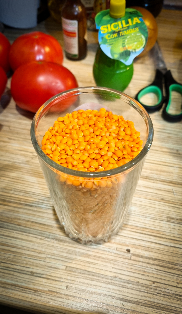 Дальше достаем из нашего бульона мясо и отправляем его остывать. Засыпаем в кастрюлю стакан промытой красной чечевицы и продолжаем варить на медленном огне.