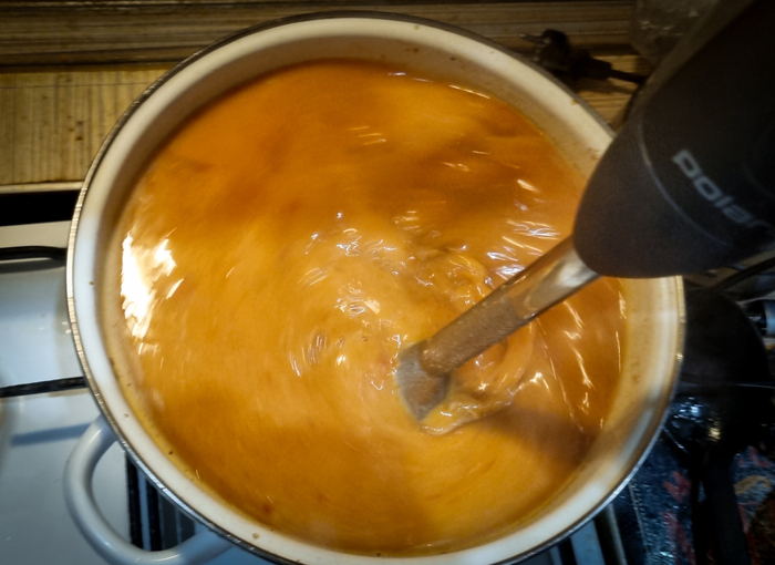 После этого берём погружной блендер и со всей революционной яростью фигачим наш суп до состояния пюре.