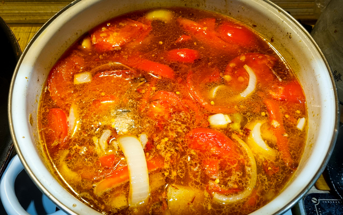 Отправляем наши печёные овощи в бульон и варим так ещё 15 минут.