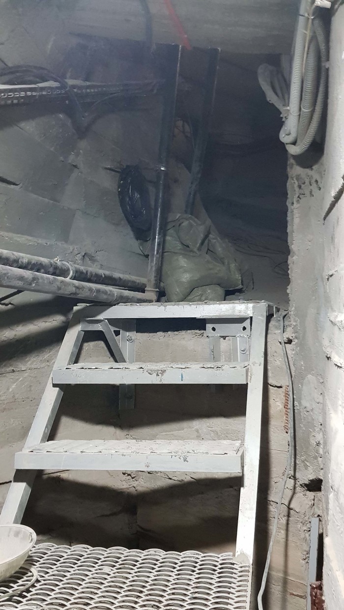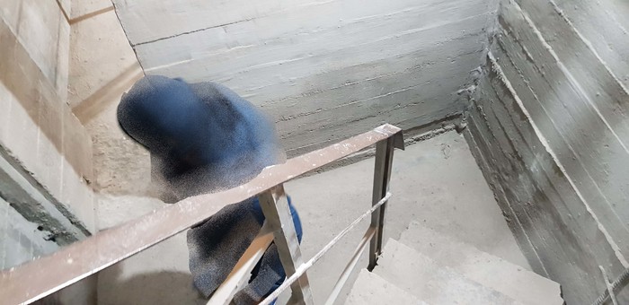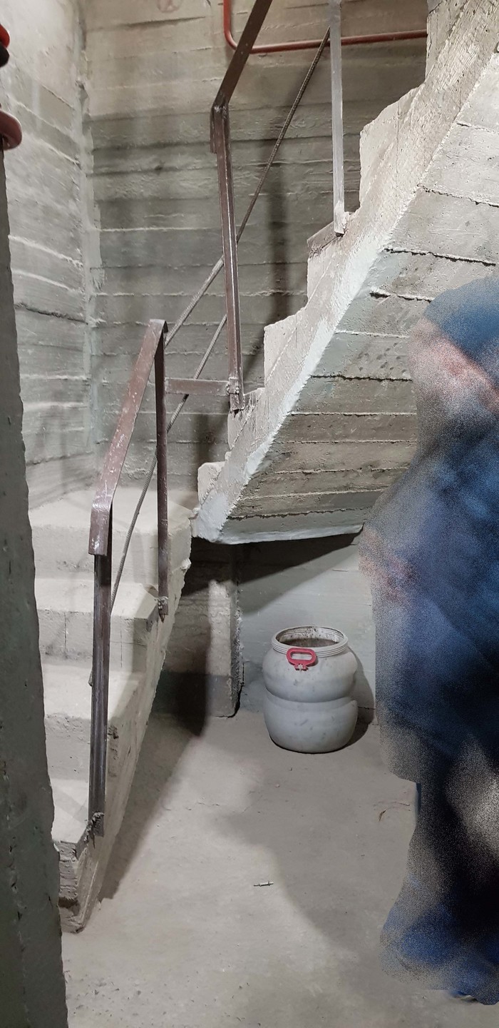 Лестница находится в районе левой ноги. Обычная крутая бетонная лестница с металлическими перилами.