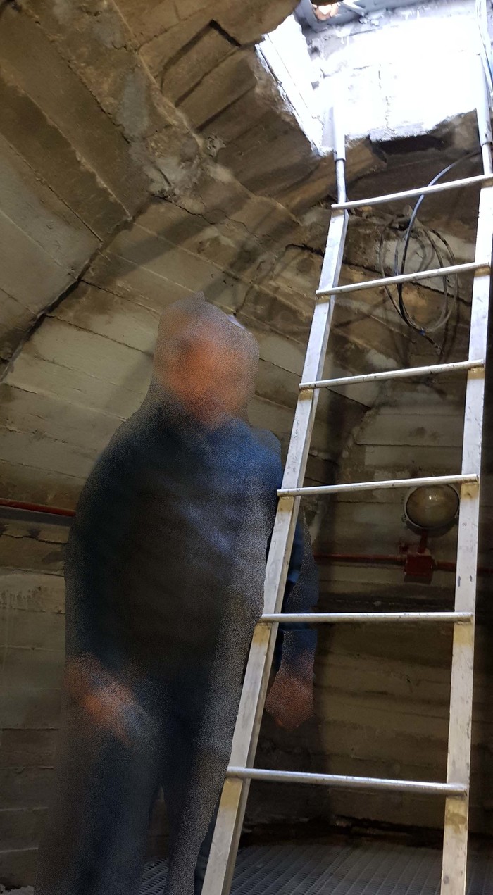 Из плеч, в голову, через шею ведет узкий лаз по металлической лестнице.