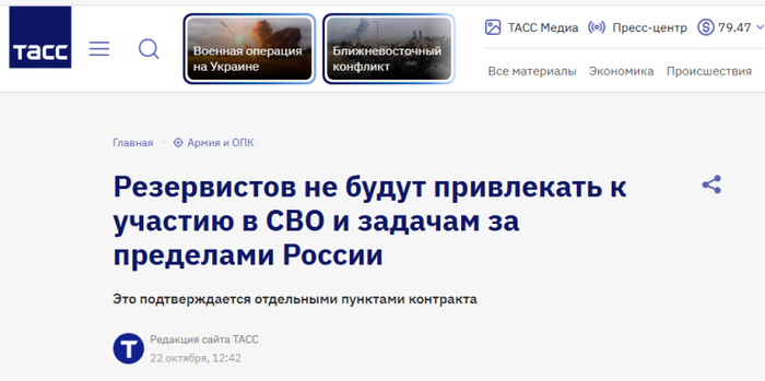 Что касается резервистов, то их не привлекают к участию в СВО или службе за пределами России, заявил замначальника Главного организационно-мобилизационного управления Генерального штаба ВС РФ вице-адмирал Владимир Цимлянский. Резервисты могут быть задействованы в защите критически важных объектов жизнеобеспечения и только на территории своего родного региона, следует из закона «Об обороне», принятого Госдумой РФ.