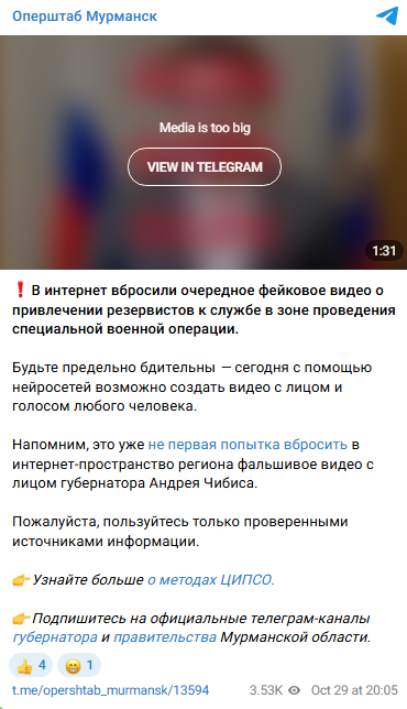 Злоумышленники создали дипфейк с губернатором Мурманской области Андреем Чибисом, в котором говорится об отправке резервистов региона в зону СВО.