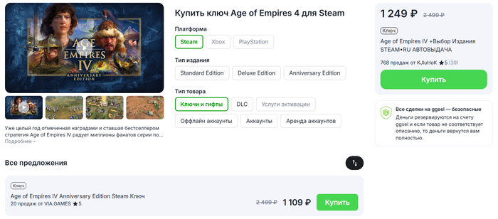 Переходим в категорию «Age of Empires IV» и выбираем подходящий товар. Также, как и в предыдущем способе, смотрим на его критерии, внимательно читаем описание и оплачиваем.