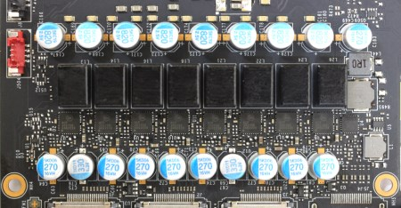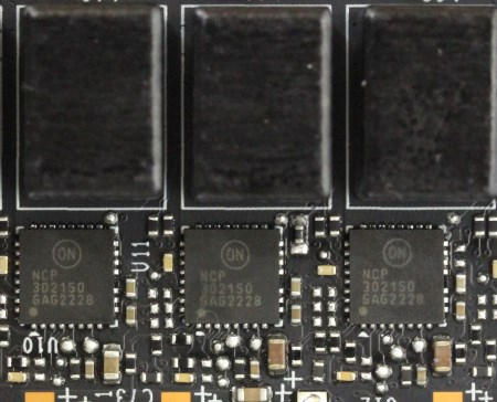 Подсистема питания графического чипа состоит из восьми фаз. Для ГП данного класса это солидный запас, даже с учетом разгона. В нем можно добиться неплохих результатов благодаря повышению лимита энергопотребления на 22 %.