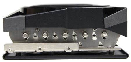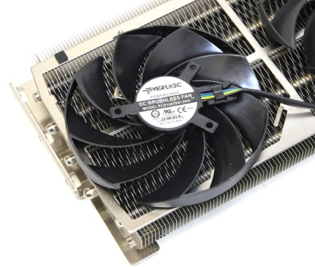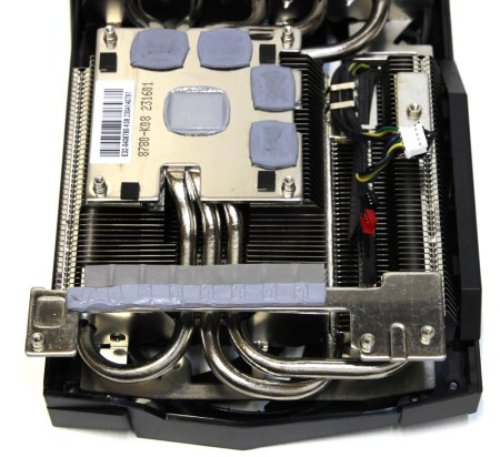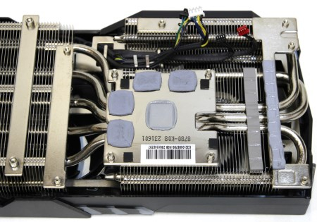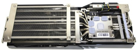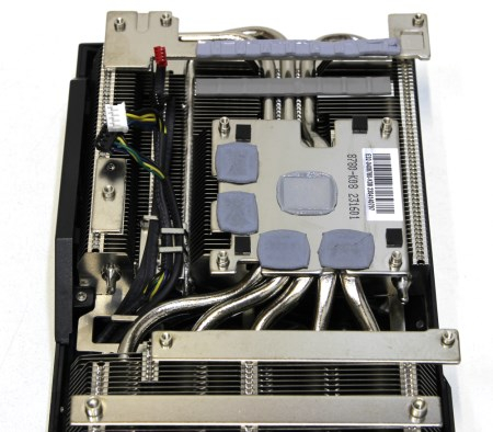 Сам кулер изготовлен по классической схеме. Две секции и пять тепловых трубок. За теплоотвод отвечает обычная медная никелированная пластина. Графический процессор контактирует с ней напрямую через термопасту, а с микросхемами памяти через термопрокладки.