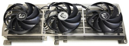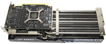 Сами пластины тоже достаточно крупные и их много. Поэтому радиатор очень похож на тот, что используется в MSI GeForce RTX 4070 Gaming X Trio, особенно это заметно по толщине. Все элементы здесь также пропаяны.