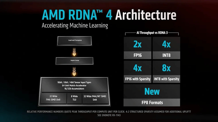 Именно так AMD называет новые блоки матричных вычислений. И не зря. В отличие от предшественников в RDNA 3, просто переназначавших SIMD векторных блоков для выполнения подобных операций, AI Accelerators являются самостоятельными вычислительными блоками — аналогично тензорным ядрам в ГП NVIDIA или матричным блокам XMX в ГП Intel.