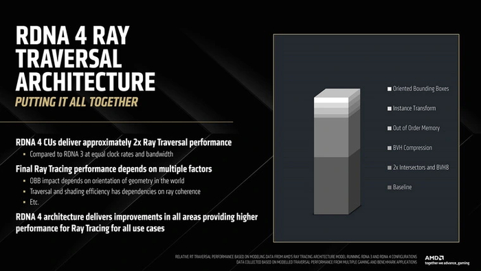 Первая реализация блоков трассировки в RDNA 2 умела просчитывать четыре пересечения луча с боксами иерархии ограничивающих объемов (BVH) либо одно пересечение с полигоном. В RDNA 3 темп расчетов остался тем же, но благодаря новой контрольной логике блоки стали работать до 80 % эффективнее. У RDNA 4 RA-блоки наконец «расширили», позволив им выполнять вдвое больше операций за такт — восемь пересечений с боксами либо два пересечения с полигонами.