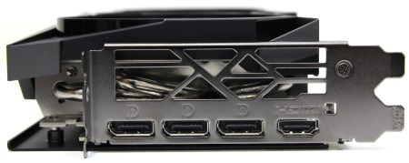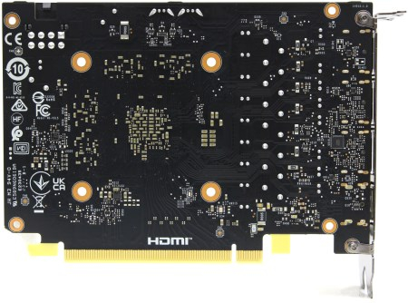 Сзади видеокарты мы снова видим защитную пластину («бекплейт»). Она также выполняет функцию теплоотвода. Кроме этого, не ней заметны огромные прорези для того, чтобы воздух проходил радиатор насквозь свободно. Это свидетельствует о том, что сама печатная плата короткая и меньше участвует в распределении тепла.