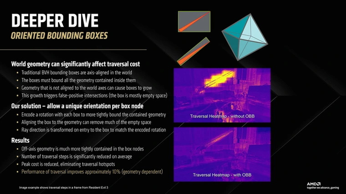 Теперь часть операций, необходимых для рейтрейсинга, ускорена аппаратно — для этого в составе Ray Accelerators появились выделенные блоки для преобразования экземпляров и управления стеком трассировки. Вычислительные ресурсы RA-блоков стали расходоваться экономнее благодаря технологии ориентированных боксов. Она предназначена для уменьшения объемов BVH, в которых необходимо просчитывать пересечения лучей за счет изменения их ориентации. При стандартном подходе эти объемы формируются в виде боксов, находящихся в пространстве строго вертикально или горизонтально. Ориентированные боксы можно размещать под любым углом, подгоняя их под форму и расположение объекта в кадре. Благодаря этому можно избавить RA-блоки от приличного объема ненужной работы.