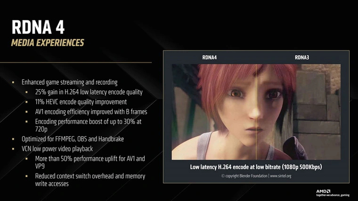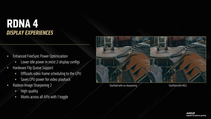 Чипы архитектуры RDNA 4 получили новый движок дисплея Radiance 2 Display Engine. Им поддерживается вывод изображения с помощью современных интерфейсов DisplayPort 2.1a и HDMI 2.1b. Главные улучшения: сниженное энергопотребление в режиме ожидания при использовании двух мониторов, новый блок повышения резкости и аппаратная поддержка технологии Flip Metering — той самой, которую NVIDIA использует в чипах Blackwell для мультигенерации кадров в DLSS 4. Не исключено, что AMD тоже готовит похожую технологию, но представит ее позже.