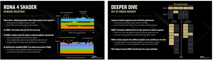 Несмотря на перевод некоторых операций на отдельные аппаратные блоки, часть вычислений для трассировки все так же выполняется на шейдерах. Но и тут не обошлось без заметных улучшений. Шейдерные процессоры RDNA получили возможность внеочередного выполнения кода и динамические регистры. Благодаря этому они могут комбинировать расчеты для трассировки и выполнение шейдерного кода гораздо эффективнее, чем это было в предшествующей RDNA 3.