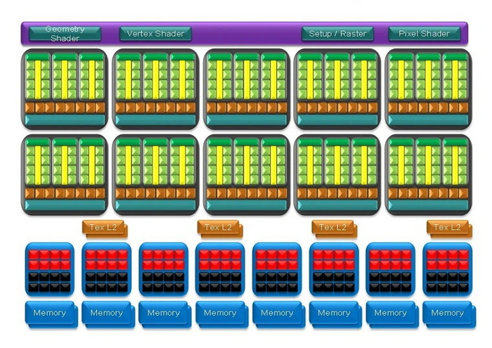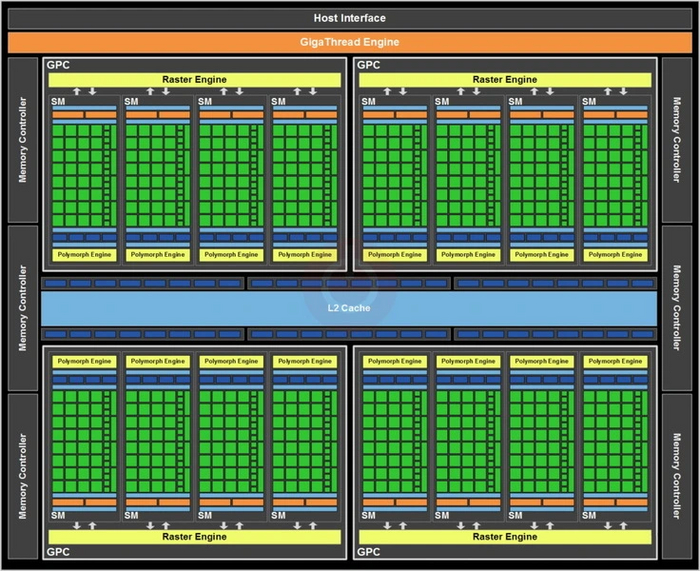 Дебютной новинкой стала карта GTX480 на чипе GF100. Он состоит из четырех вычислительных графических кластеров (GPC). В каждом из них находятся по четыре SM. Один SM содержит 32 SP и блок Polymorph Engine, предназначенный для работы тесселяции.