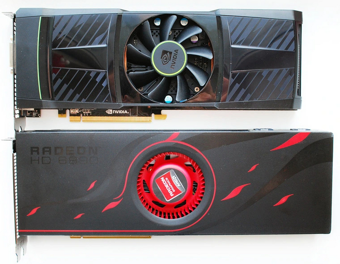 Двухчиповая Radeon HD5970 конкурента в прошлом поколении осталась без ответа. В марте AMD, которая уже перестала использовать в названиях карт бренд ATI, запускает следующую «двухголовую» карту HD6990. На этот раз NVIDIA подготовила ответную меру: ей стала GTX590, представляющая собой склейку из двух GTX580 со сниженными частотами. TDP достиг внушительных 365 Вт, вследствие чего карта впервые потребовала двух дополнительных разъемов питания 8-pin.