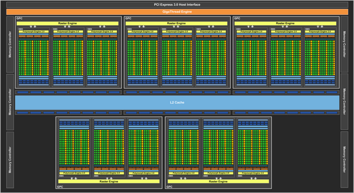 GK110, ставший основой карты, построен на той же архитектуре Kepler. По сравнению с GK104, чип разросся «вширь». Новый ГП имеет пять GPC, в каждом из которых три SM. В каждом SM значительно возросло число блоков FP64, обычно используемых для неигровых вычислений — с 8 до 32.