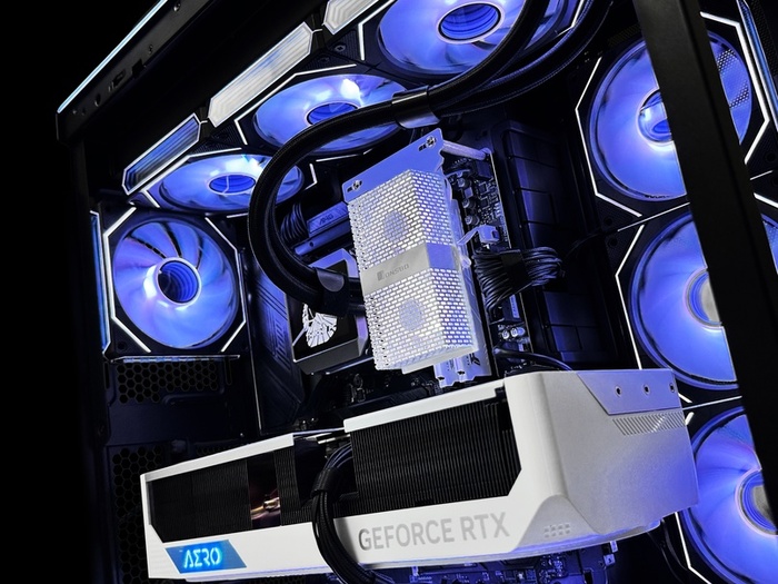 На радиаторе СЖО сделана система PUSH&PULL, состоящая из 6 вентиляторов, 3 сбоку и 3 снизу на вдув, 1 вентилятор сзади на выдув и 2 вентилятора на радиаторе для охлада ОЗУ