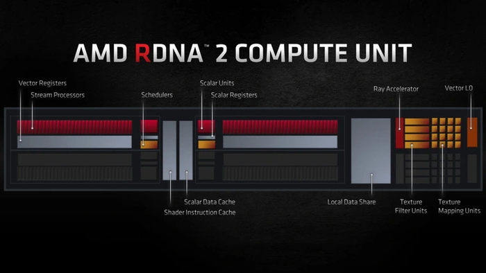 Cхоже устроены и ГП AMD, с тем отличием, что модули у них называются по-другому. Самым небольшим из них является вычислительный блок (Compute Unit, CU). Каждый CU современных моделей содержит 64 шейдерных процессора, четыре блока TMU, одно RT-ядро, кэш-память и регистровый файл. Два вычислительных блока объединяются в один процессор групповой обработки (Work Group Processor, WGP). Или как его еще называют, Dual CU.