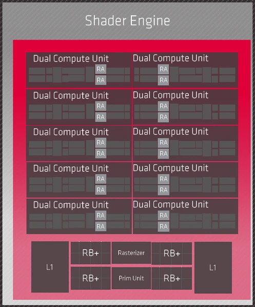 В последнем поколении ГП Radeon RX7000 каждый CU вдобавок к этому набору имеет два блока матричного ускорения. Из восьми Dual CU и 32 ROP образуется один крупный шейдерный движок (Shader Engine, SE) — аналог графического вычислительного кластера от NVIDIA, содержащий в себе все необходимые блоки для работы с графикой. Аналогично конкуренту, в графических процессорах AMD таких шейдерных движков несколько.