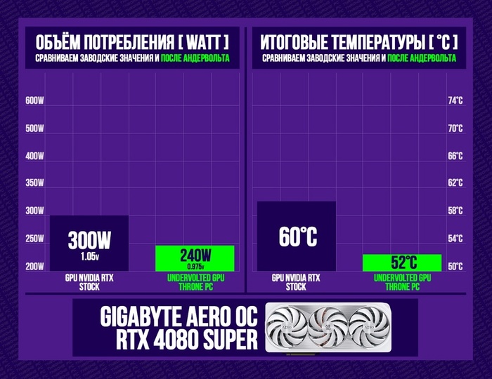 Уменьшили итоговые объёмы потребления на 20% (с 300 ватт до 240), получив на выходе температуру в 52 градуса вместо заводских 60! И всё это с сохранением ФПС с коробки (если бы вы просто приобрели готовую сборку).