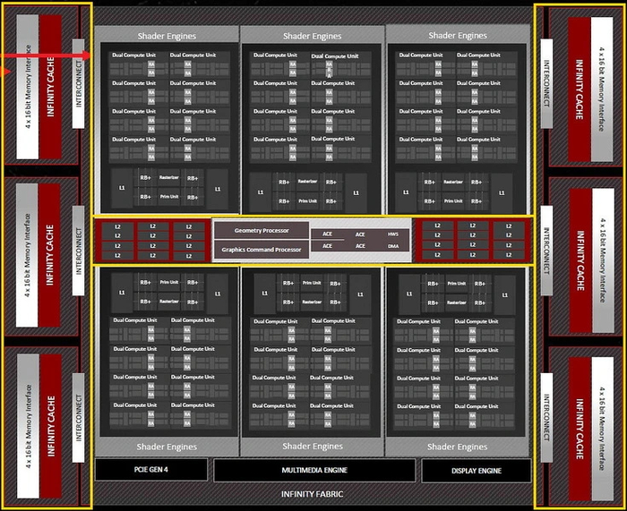 В отличие от двух других производителей, в ГП AMD блоки обработки геометрии и асинхронных вычислений выделены из состава вычислительных блоков и находятся рядом с кэшем L2. Вслед за ним следует память Infinity Cache, которая играет роль кэша третьего уровня, и лишь потом графическая ОЗУ.