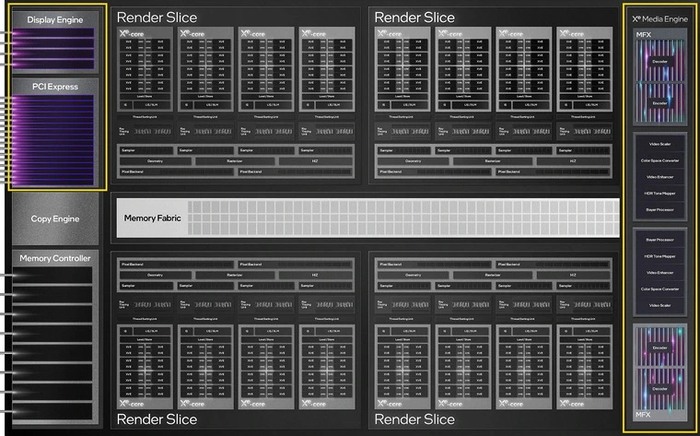 Четыре ядра XE объединены в более крупный модуль Render Slice. Помимо ядер XE, в нем содержатся четыре RT-ядра, 16 блоков ROP и процессор обработки геометрии. Аналогично графическому вычислительному кластеру NVIDIA и шейдерному движку AMD, Render Slice имеет все нужные блоки для работы с графикой. Вычислительную часть графического процессора Intel образуют несколько подобных блоков.
