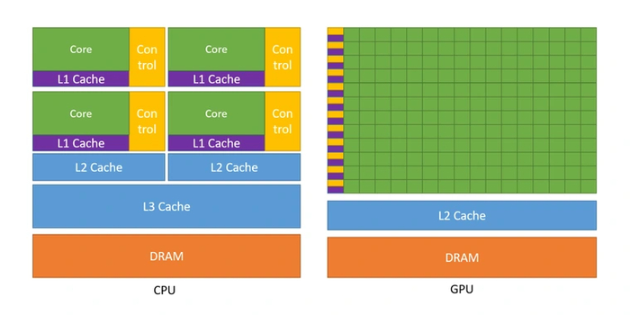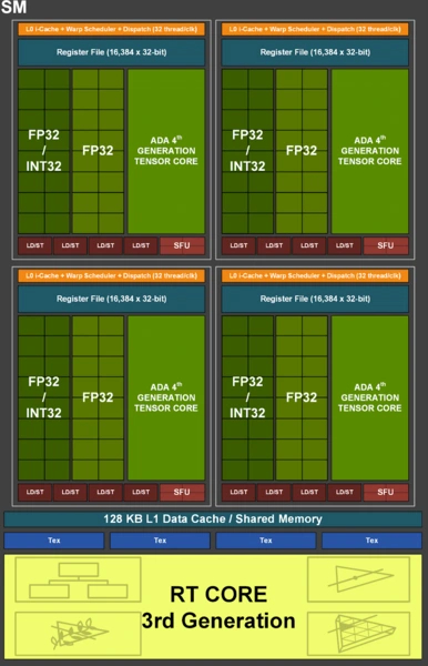У ГП NVIDIA самый маленький вычислительный модуль — потоковый мультипроцессор (Streaming Multiprocessor, SM). К примеру, в видеокарте RTX4090 такой модуль разделен на четыре части, в каждой из которой находится 32 ядра CUDA и одно тензорное ядро. По аналогии с ядром центрального процессора, каждая часть оснащена блоками загрузки данных и регистровым файлом. Общая часть SM содержит 128 КБ кэша, четыре TMU, RT-ядро и процессор обработки геометрии.