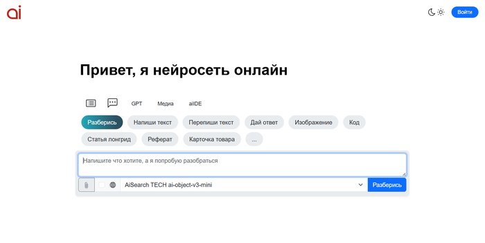 AISearch — онлайн-сервис для выполнения пользовательских запросов. Предоставляет доступ к модели AiS-video для создания креативного ролика. Пользователь может прикрепить исходный файл при генерации видео.