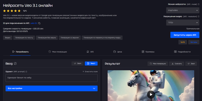 Когда я впервые попробовал GenAPI с моделью Veo 3.1, сразу понял, что это не просто очередной текст‑to‑video инструмент, а настоящая «машина» для создания коротких видео с озвучкой, где визуальная часть и звук генерируются синхронно. Эта модель умеет превращать текстовые описания в динамичные ролики с естественной речью, аудио‑эффектами и плавным визуальным рядом — как будто вы снимаете мини‑фильм по сценарию. Через GenAPI управлять Veo 3.1 удобно: вы просто отправляете промт, а сервис возвращает видео, готовое к публикации или доработке, что экономит часы монтажа. Конечно, стоимость напрямую зависит от длины и качества видео, но для коротких тизеров и социальных роликов это отличный вариант, особенно если нужны детали и звук «из коробки».
