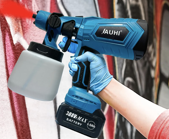 Беспроводной пистолет-распылитель JAUHI 1000 мл под Makita 18 В подходит для покраски, пропиток и небольших отделочных работ, когда важна мобильность. Объём 1000 мл удобен для средних задач: забор, мебель, стены, обработка дерева, где не хочется постоянно доливать материал.