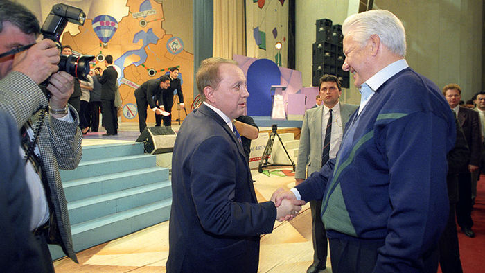 Президент Международного союза КВН Александр Масляков и президент Российской Федерации Борис Ельцин, 1996 год.