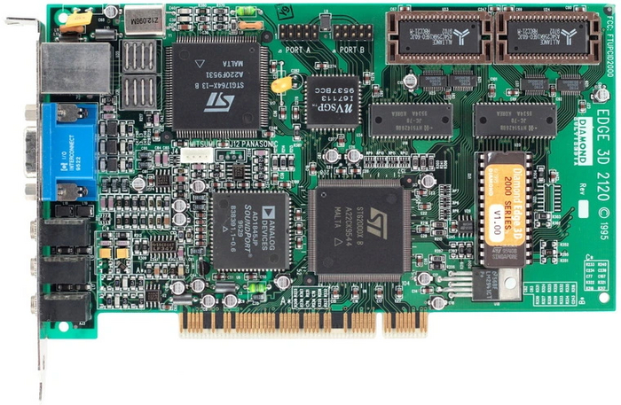 В течение двух лет NVIDIA разрабатывала свой первый продукт, и, наконец, представила его в мае 1995 года. Это была мультимедийная карта STG-2000 на базе чипа NV1. Плата имела разъем PCI и объединяла в себе 3D-ускоритель, блок работы с 2D-графикой и звуковую карту.