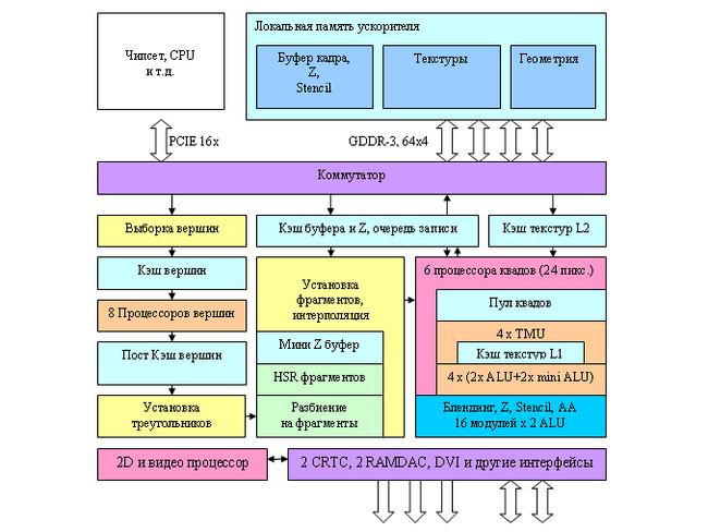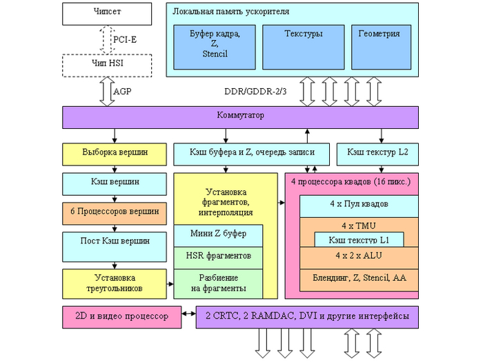 Помимо этого, в чипе шесть вершинных шейдеров, а также 16 блоков ROP. Интерфейс памяти 256-битный. Он способен работать с DDR, DDR2 и GDDR3, пиковая пропускная способность которой достигла 35 ГБ/c. NV40 используется в серии видеокарт GeForce 6800.
