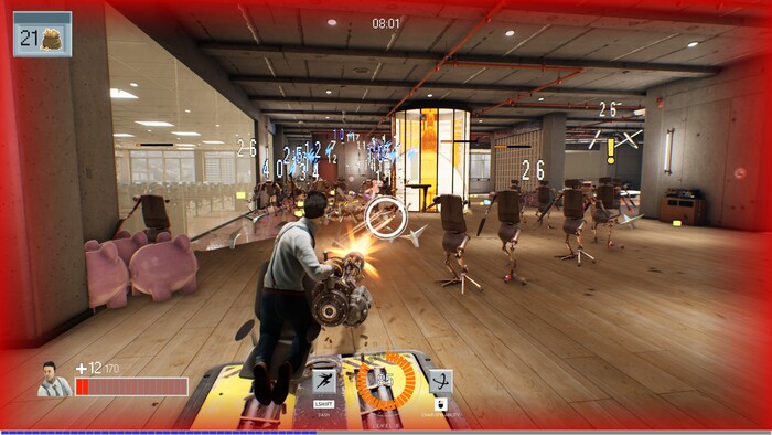 Чем дольше мы нам удаётся прожить, тем больше разнообразных врагов на нас вываливают. Если по началу это роботы, то дальше на нас летят вентиляторы, надвигаются кактусы в горшках, маршируют офисные кресла и прочая утварь. У каждого свои атаки и это нужно учитывать.