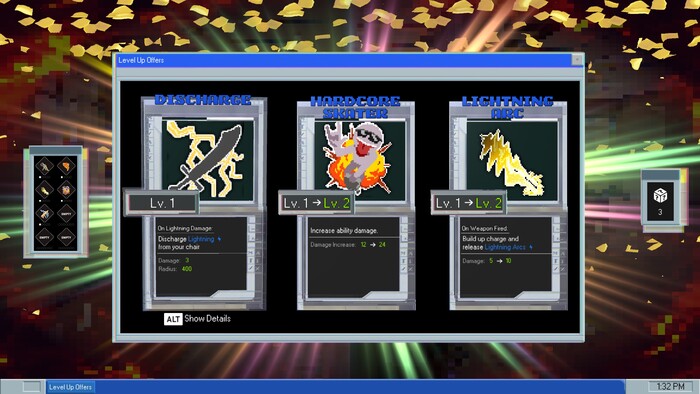 А где элементы рогалика? Всё на месте. Мы убиваем врагов, с них выпадает пачки опыта, их нужно подбирать. По мере набора определённого количества нам открывается возможность забрать/прокачать 1 из 3 случайных перков. Это может быть как увеличение здоровья или брони, так и прокачка возможностей кресла.